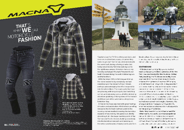 ‘ Captains Log ’ for TV One a few years back , and once on an adventurous pass , circumventing some rough stuff further out , directly beneath the point itself , during a fishing charter . But today would be my first time walking out to the lighthouse proper . I ’ d ridden there on my recently exchanged Triumph Thruxton R , but hadn ’ t fancied doing the walk in blistering sun and full leathers . With the Vespa 300s in full song we shot up the island , waved-to by everybody ; we had somehow won the respect of sport-bikers , perhaps acknowledging the effort required to ride 12 inchers there . The roads up to the Cape are pleasing , with long straights , fast twitching corners and swooping curves , all while delivering attention-grabbing , enticing views of the horizon and those vast white sand dunes along Great Exhibition Bay . Arrival at the Cape was met with great feelings of elation and satisfaction . We ’ d rolled our willing Vespas to the farthest northern point in the country , and we revelled in seeing the twin blue expanse of sea and sky . We gazed out , silently absorbing it all - the huge meeting point of the Tasman and Pacific Oceans , butting ceaselessly into the headland ramparts and breaking on the white sand beaches fringing Spirits and Tom