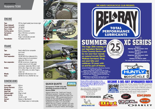 THE HUNTLY MOTORCYCLE CLUB PRESENTS SUMMER The huge 25th running of our legendary Summer Cross Country Series will be run over four rounds on natural terrain North Waikato farmland. Drag out your bike and celebrate 25 years with us and be part of history. 25 YEARS XC SERIES Round 1 Sunday 2nd December 2018 Round 2 Sunday 13th January 2019 Round 3 Saturday 2nd February 2019 Round 4 Sunday 3rd March 2019 For venues www.huntlymotorcycleclub.co.nz Juniors & Club Ladies race 1.5hr Cross Country race in the morning Seniors (incl Senior Ladies) race 2hr Cross Country race after the Junior race has completed. Entry per round $60 Senior & $50 Junior. Prizes for class winners, holeshot and first lap leaders. MNZ Event so bring your current licence or purchase a Day Licence for $25 each. Venues will be confirmed closer to the event due to weather conditions so check our Facebook page or Website for updates. Sorry no dogs or tear-offs as we run on working farms. BECOME A BEL-RAY SPONSORED RIDER Sign in from:8:00am. Starts at:9:30am www.huntlymotorcycleclub.co.nz Contacts: Neville 021 058 0405 Andrew 027 309 7543 Paul 0274 748 323 Dave 027 278 5247 SPONSORED RIDER Simply enter all four rounds of the 25th Anniversary Bel-Ray Cross Country Series and you will be in the draw to WIN one years supply of Bel-Ray products for your bike. You must be present at final prize giving and help with social media exposure. Some T & C’s apply see www.dirtguide.co.nz/news for details.