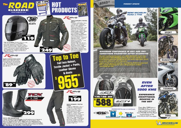 PRODUCT UPDATE ROAD 5 TYRE SPORT MAXIMUM CONFIDENCE IN WET AND DRY CONDITIONS KILOMETRE AFTER KILOMETRE The wet weather performance of a USED MICHELIN ® Road 5 tyre is as good as a NEW MICHELIN ® Pilot ® Road 4 tyre thanks to our revolutionary patented MICHELIN XST Evo water drop sipes, which grow wider kilometre after kilometre. 1 Improved dry grip and stability 2 provided by Michelin’s patented ACT+ casing technology for more riding pleasure without sacrifi cing tyre life. 3 ROADSTERS (1) Based on internal wet braking testing conducted in 2016 in Ladoux, France on wet surfaces using a 2013 SUZUKI 1250 Bandit S fitted with 120/70 ZR 17 front and 180/55 ZR17 rear tyres comparing a new MICHELIN® Pilot® Road 4 tyre and a worn (5,000 kms) MICHELIN Road 5 tyre. Actual results may vary. | (2) Based on internal testing conducted in 2016 in Ladoux, France using a 2015 Triumph Street Triple fitted with 120/70 ZR 17 front and 180/55 ZR17 rear tyres comparing the dry handling and stability of a MICHELIN® Road 5 tyre with a MICHELIN Pilot Road 4 tyre. Actual results may vary. | (3) Based on 2017 third party commissioned tests conducted by Dekra Test Center on public roads in France on a TRIUMPH Street S triple fitted with 120/70 ZR 17 front and 180/55 ZR17 rear tyres comparing the tread life of a MICHELIN® Road 5 tyre with a MICHELIN Pilot Road 4 tyre. Actual results may vary. EVEN AFTER 5000 KMS TOURING EXPERIENCE EXCEPTIONAL BRAKING IN THE WET 120/180 SET $ 588 rrp MICHELIN XST Evo sipes are evolutionary New Tyre Worn Tyre Even after 5000 kms, a MICHELIN Road 5 tyre stops as short as a brand new MICHELIN Pilot Road 4 tyre thanks to the MICHELIN XST Evo sipes. TRAIL