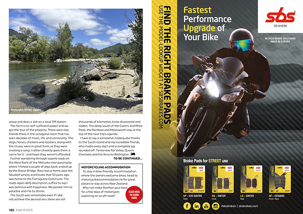setup and does a slot on a local FM station. The farm is on self-sufficient power and we got the tour of the property. There were two friends there in the octagonal room that has seen decades of music, life, and conviviality. The dogs, horses, chickens and roosters, along with the musos, were in great form, as they were creating a song. I rather cheekily gave them a name for it- and hope they weren’ t offended. Further wandering through superb roads on the West Bank of the Motueka river passing by where I fished a couple of days back, ended up by the Baton Bridge. Ross led us home past the Neudorf winery and Estate that 50 years ago was home to the Famagusta Commune. The roads again defy description, suffice to say I was delirious with happiness. We parted, him to paradise and me to dinner. The South was remarkable even if I did not achieve the desired aim, there are still thousands of kilometres to be discovered and ridden. The deep south of the Catlins and Mitre Peak, the Rainbow and Molesworth stay at the top of the next trip’ s agenda. I have to say a somewhat inadequate thanks to the South Island and my incredible friends, who made every day’ s end a complete joy rounded off. Tomorrow, Rai Valley, Queen Charlotte and the ferry to Wellington.