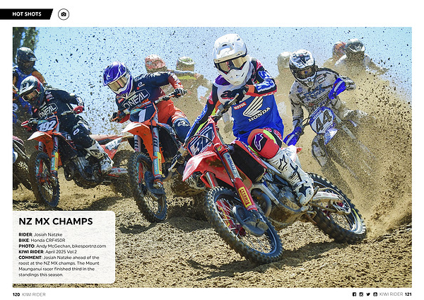 RIDER: Josiah Natzke BIKE: Honda CRF450R PHOTO: Andy McGechan, bikesportnz. com KIWI RIDER: April 2025 Vol. 2 COMMENT: Josiah Natzke ahead of the roost at the NZ MX champs. The Mount Maunganui racer finished third in the standings this season.