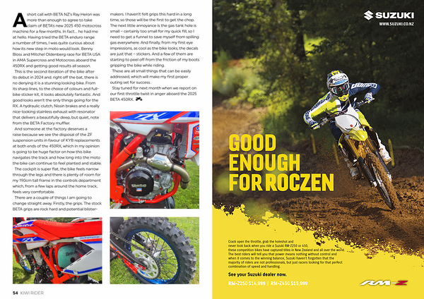 short call with BETA NZ’ s Ray Heron was more than enough to agree to take claim of BETA’ s new 2025 450 motocross machine for a few months. In fact … he had me at hello. Having tried the BETA enduro range a number of times, I was quite curious about how its new step in moto would look. Benny Bloss and Mitchel Oldenberg race for BETA USA in AMA Supercross and Motocross aboard the 450RX and getting good results all season. This is the second iteration of the bike after its debut in 2024 and. right off the bat, there is no denying it is a stunning looking bike. From its sharp lines, to the choice of colours and fullbike sticker kit, it looks absolutely fantastic. And good looks aren’ t the only things going for the RX. A hydraulic clutch, Nissin brakes and a really nice-looking stainless exhaust with resonator that delivers a beautifully deep, but quiet, note from the BETA Factory muffler. And someone at the factory deserves a raise because we see the disposal of the ZF suspension units in favour of KYB replacements at both ends of the 450RX, which in my opinion is going to be huge factor on how this bike navigates the track and how long into the moto the bike can continue to feel planted and stable. The cockpit is super flat, the bike feels narrow through the legs and there is plenty of room for my 190cm tall frame in the controls department which, from a few laps around the home track, feels very comfortable. There are a couple of things I am going to change straight away. Firstly, the grips. The stock BETA grips are rock hard and potential blistermakers. I haven’ t felt grips this hard in a long time, so those will be the first to get the chop. The next little annoyance is the gas tank hole is small – certainly too small for my quick fill, so I need to get a funnel to save myself from spilling gas everywhere. And finally, from my first eye impressions, as cool as the bike looks, the decals are just that – stickers. And a few of them are starting to peel off from the friction of my boots gripping the bike while riding. These are all small things that can be easily addressed, which will make my first proper outing set for success. Stay tuned for next month when we report on our first throttle twist in anger aboard the 2025 BETA 450RX.