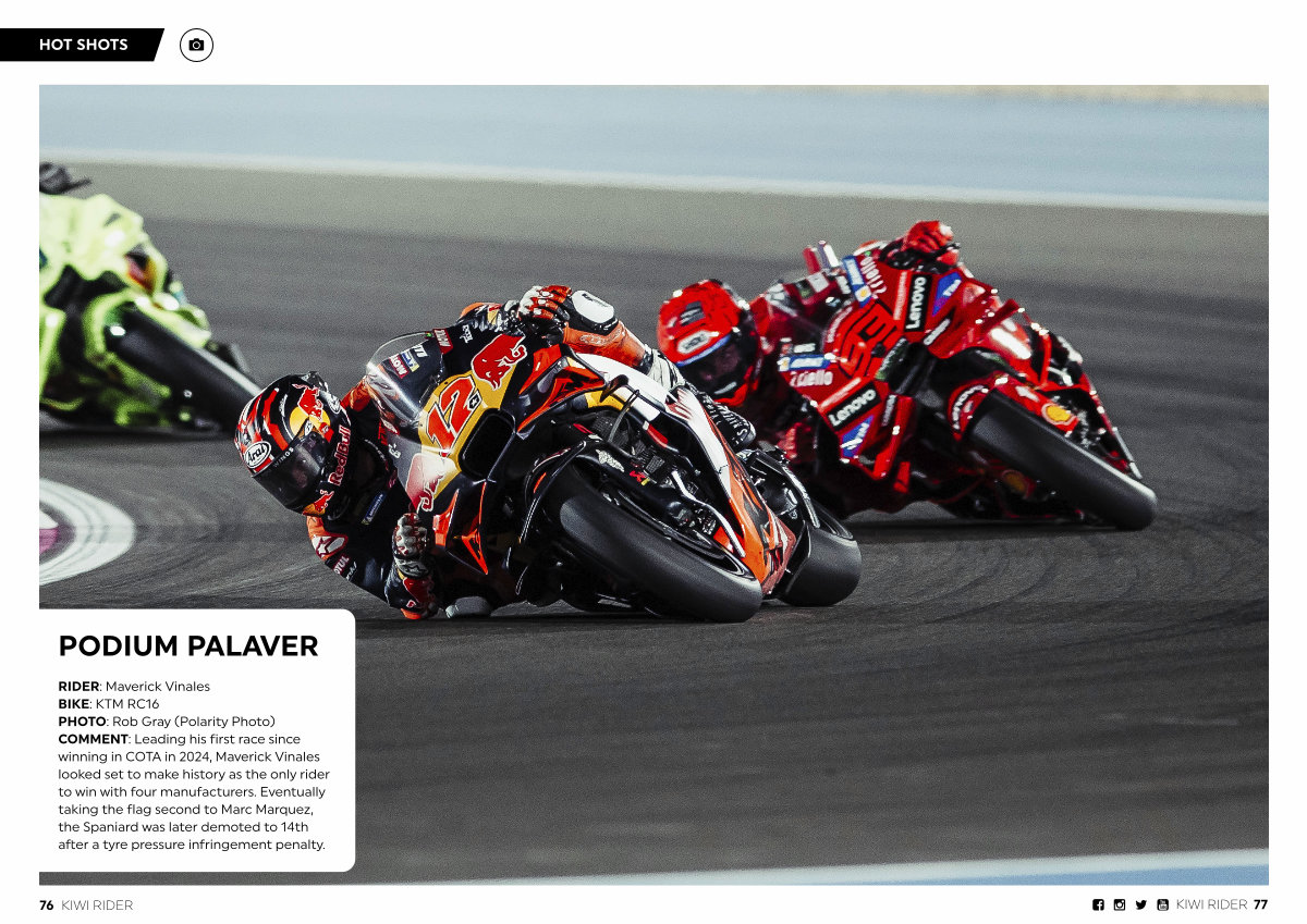 RIDER: Maverick Vinales BIKE: KTM RC16 PHOTO: Rob Gray( Polarity Photo) COMMENT: Leading his first race since winning in COTA in 2024, Maverick Vinales looked set to make history as the only rider to win with four manufacturers. Eventually taking the flag second to Marc Marquez, the Spaniard was later demoted to 14th after a tyre pressure infringement penalty.
