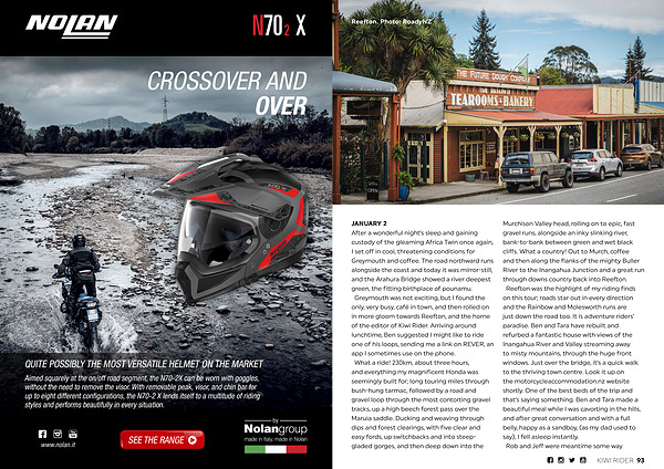 JANUARY 2 After a wonderful night’ s sleep and gaining custody of the gleaming Africa Twin once again, I set off in cool, threatening conditions for Greymouth and coffee. The road northward runs alongside the coast and today it was mirror-still, and the Arahura Bridge showed a river deepest green, the fitting birthplace of pounamu. Greymouth was not exciting, but I found the only, very busy, café in town, and then rolled on in more gloom towards Reefton, and the home of the editor of Kiwi Rider. Arriving around lunchtime, Ben suggested I might like to ride one of his loops, sending me a link on REVER, an app I sometimes use on the phone. What a ride! 230km, about three hours, and everything my magnificent Honda was seemingly built for; long touring miles through bush-hung tarmac, followed by a road and gravel loop through the most contorting gravel tracks, up a high beech forest pass over the Maruia saddle. Ducking and weaving through dips and forest clearings, with five clear and easy fords, up switchbacks and into steepgladed gorges, and then deep down into the
