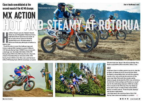 Hamilton’ s Kayne Lamont, Takaka’ s Hamish Harwood, and Mangakino’ s Maximus Purvis maintained their respective class leads at the second of four rounds of the New Zealand Motocross Championships in Rotorua in February, although not without a fight or two. The 2018 series is now at the halfway stage and former national MX2 champion Lamont( Altherm JCR Yamaha Racing Team YZ450F) has a nine-point advantage over Australian Kirk Gibbs( CML KTM Racing Team 450) in the MX1 class; Purvis is 12 points ahead of Australian Mason Semmens( CML KTM Racing Team 125SX) in the 125cc class and Harwood( CML KTM Racing Team 250SX) now enjoys a massive