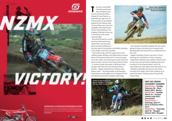 T he four-round 2021 Yamaha-sponsored New Zealand Crosscountry Championships kicked off near Marton in late February ago and on that occasion it was Napierbased former Wairoa rider Tommy Watts who stole the spotlight , with Palmerston North ’ s Paul Whibley in his shadow , finishing runner-up in the three-hour senior race that day . But wind forward to round two near Dannevirke two weeks later and the roles were reversed , Whibley on the top step of the podium and Watts standing in his shade in the No . 2 position . That means that , with the series now at the halfway stage , Whibley and Watts have an equal share of the points lead and it ’ s now all to play for as the riders now head across Cook Strait for back-to-back rounds in the South Island in April . It could so easily have been a different story , though , with the man who finished third in Marton – Napier-based former Wairoa man Reece Lister – the early leader at Dannevirke and looking comfortable as he charged off into the distance and built a healthy advantage .