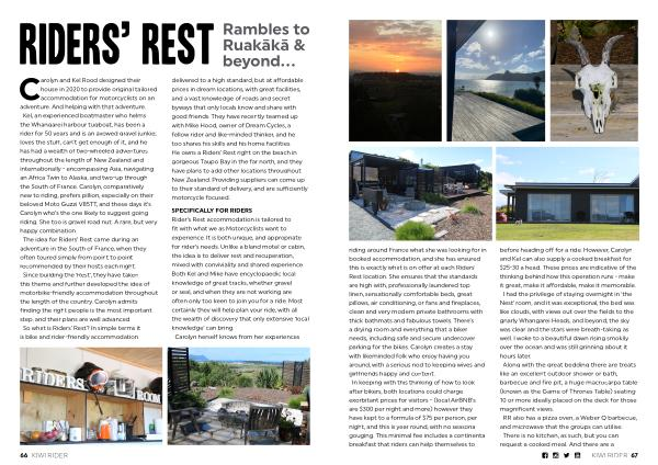Carolyn and Kel Rood designed their house in 2020 to provide original tailored accommodation for motorcyclists on an adventure . And helping with that adventure . Kel , an experienced boatmaster who helms the Whangarei harbour tugboat , has been a rider for 50 years and is an avowed gravel junkie ; loves the stuff , can ’ t get enough of it , and he has had a wealth of two-wheeled adventures throughout the length of New Zealand and internationally - encompassing Asia , navigating an Africa Twin to Alaska , and two-up through the South of France . Carolyn , comparatively new to riding , prefers pillion , especially on their beloved Moto Guzzi V85TT , and these days it ’ s Carolyn who ’ s the one likely to suggest going riding . She too is gravel road nut . A rare , but very happy combination . The idea for Riders ’ Rest came during an adventure in the South of France , when they often toured simply from point to point recommended by their hosts each night . Since building the ‘ Rest ’, they have taken this theme and further developed the idea of motorbike-friendly accommodation throughout the length of the country . Carolyn admits finding the right people is the most important step , and their plans are well advanced . So what is Riders ’ Rest ? In simple terms it is bike and rider-friendly accommodation delivered to a high standard , but at affordable prices in dream locations , with great facilities , and a vast knowledge of roads and secret byways that only locals know and share with good friends . They have recently teamed up with Mike Hood , owner of Dream Cycles , a fellow rider and like-minded thinker , and he too shares his skills and his home facilities . He owns a Riders ’ Rest right on the beach in gorgeous Taupo Bay in the far north , and they have plans to add other locations throughout New Zealand . Providing suppliers can come up to their standard of delivery , and are sufficiently motorcycle focused .