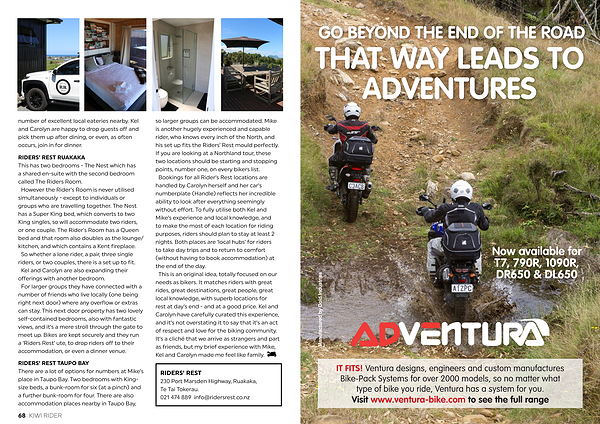 so larger groups can be accommodated . Mike is another hugely experienced and capable rider , who knows every inch of the North , and his set up fits the Riders ’ Rest mould perfectly . If you are looking at a Northland tour , these two locations should be starting and stopping points , number one , on every bikers list . Bookings for all Rider ’ s Rest locations are handled by Carolyn herself and her car ’ s numberplate ( Handle ) reflects her incredible ability to look after everything seemingly without effort . To fully utilise both Kel and Mike ’ s experience and local knowledge , and to make the most of each location for riding
