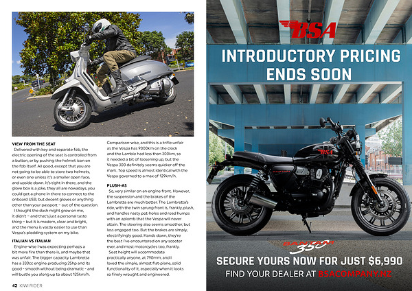 Comparison-wise, and this is a trifle unfair as the Vespa has 9000km on the clock and the Lambie had less than 300km, so it needed a bit of loosening up, but the Vespa 300 definitely seems quicker off the mark. Top speed is almost identical with the Vespa governed to a max of 129km / h.