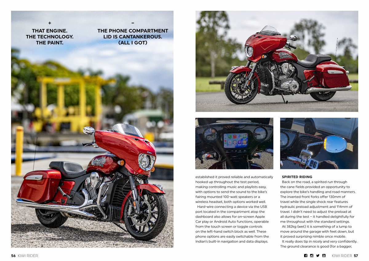 established it proved reliable and automatically hooked up throughout the test period, making controlling music and playlists easy, with options to send the sound to the bike’ s fairing mounted 100-watt speakers or a wireless headset, both options worked well. Hard-wire connecting a device via the USB port located in the compartment atop the dashboard also allows for on-screen Apple Car play or Android Auto functions, operable from the touch screen or toggle controls on the left-hand switch block as well. These phone options are easily switchable from the Indian’ s built-in navigation and data displays.
