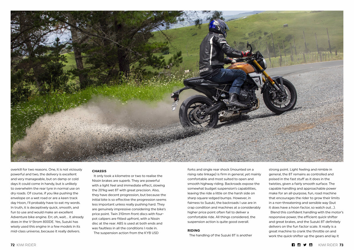 RIDING The handling of the Suzuki 8T is another strong point. Light feeling and nimble in general, the 8T remains as controlled and poised in the fast stuff as it does in the twisties, given a fairly smooth surface. The capable handling and approachable power make for an all-purpose, fun, road machine that encourages the rider to grow their limits in a non-threatening and sensible way( but it does have a hoon factor, so watch out …). Blend this confident handling with the motor’ s responsive power, the efficient quick-shifter and great brakes, and the Suzuki 8T definitely delivers on the fun factor scale. It really is a great machine to crank the throttle on and work the quick-shifter up the gears and lay it