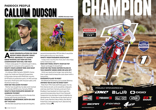second championship. Off the bike it would be being able to buy our own house. WHAT’ S YOUR FAVOURITE DISCIPLINE? I enjoy cross-country the most, but I also enjoy some motocross now. RACE DAY FOOD, WHAT’ S YOUR GO TO? Bacon and eggs for breakfast! WHAT DO YOU THINK MOTORCYCLING IN THIS COUNTRY NEEDS MORE OR LESS OF? I think we need some longer race series but then it gets hard to keep the costs down with a long series. FAVOURITE PLACE TO RIDE? Dirt World at Pukemara, just outside Rotorua. ANYONE YOU’ D LIKE TO SHOUT OUT? Pete from THS moto definitely gave me my first chance to win, so he would be a big part, and now Josh from Yamaha and Liam from Bradley’ s have backed me fully to get this second championship. Kevin from Flying W Suspension has also been huge in helping my development. I’ d also like to say thank you to Pirelli, Leatt, Renthal, Meca Moto, Dirt World Pukemara, and especially mum, dad and my partner, Teresa.