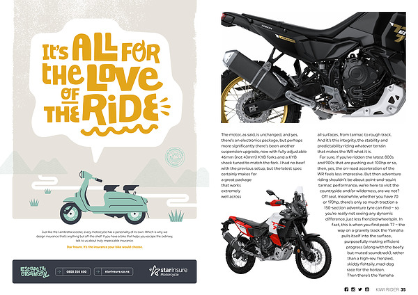 all surfaces, from tarmac to rough track. And it’ s this integrity, the stability and predictability riding whatever terrain that makes the WR what it is. For sure, if you’ ve ridden the latest 800s and 900s that are pushing out 100hp or so, then, yes, the on-road acceleration of the WR feels less impressive. But then adventure riding shouldn’ t be about point-and-squirt tarmac performance, we’ re here to visit the countryside and / or wilderness, are we not? Off seal, meanwhile, whether you have 70 or 170hp, there’ s only so much traction a 150-section adventure tyre can find – so you’ re really not seeing any dynamic difference, just less frenzied wheelspin. In fact, this is when you find peak T7 – the way on a gravelly track the Yamaha pulls itself into the surface, purposefully making efficient progress( along with the beefy but muted soundtrack), rather than a high-rev, frenzied, skiddy fishtaily, mad-dog race for the horizon. Then there’ s the Yamaha