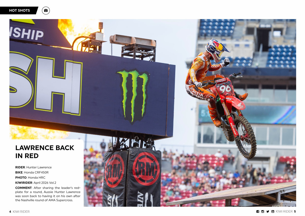 RIDER: Hunter Lawrence BIKE: Honda CRF450R PHOTO: Honda HRC KIWIRIDER: April 2026 Vol. 2 COMMENT: After sharing the leader’ s redplate for a round, Aussie Hunter Lawrence was soon back to having it on his own after the Nashville round of AMA Supercross.
