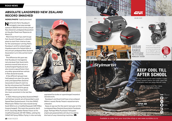 Northland’ s Patric Nussbaum managed a two way average speed of 380.018 km / h at the annual New Zealand Landspeed Association on Goudies Road near Reporoa on March 21. Most know that if you want to go fast, Suzuki ' s Hayabusa is a decent place to start from. And so it was, for the second year running, Patric Nussbaum and his turbocharged Hayabusa were the fastest bike at the annual Landspeed New Zealand Association run in the central north island. The difference this year was that Nussbaum managed to not only beat Cole Scammell ' s previous record( also set on a turbocharged Hayabusa), but also record a speed faster than any other ground driven vehicle in New Zealand records. A few different groups have held speed runs over the years, and Land Speed New Zealand( association) doesn’ t claim to be the only group, but President John Seccombe and his group of helpers seem to have been the most consistent in the last few years. In 2022, Motorcycling New Zealand( MNZ) ratified two records set at Seccombe’ s Land Speed New Zealand event. First the( MNZ) Motorcycle 1050cc fuel class record set by Scott Wilkins on a modifed Kawasaki H2R 998cc( supercharged). This took the record to 364.5 km / h. Secondly, Walter Rands-Trevor on his modified Kawasaki ZX-10R 1000cc, setting the( MNZ) NZ flying 1050cc Flying ¼ mile normally