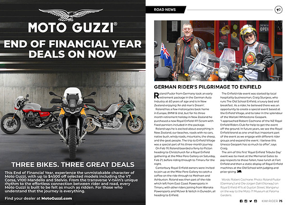 Roland Pudor from Germany took an early retirement package in the German Auto Industry at 60 years of age and is in New Zealand enjoying‘ An old man’ s Dream’. Roland has a few motorcycles back home in Europe, BMW & Ural, but for his three month retirement holiday in New Zealand he purchased a new Royal Enfield 411 Scram with fixed panniers included in the package. Roland says he is excited about everything in New Zealand, our beaches, roads with no cars, native bush, windy roads, mountains, the sheep, and the geat people. The trip to Enfield Village was a special part of his three-month journey. On Feb 19, Roland boarded a ferry to Picton heading to Christchurch for a Royal Enfield gathering at the Mike Pero Gallery on Saturday, Feb 21, before riding through to Timaru for the night. Canterbury Royal Enfield owners were invited to join up at the Mike Pero Gallery to catch a coffee on the ride through to Methven and Ashburton. Roland was then part of the ride which left from East Coast Powersports in Timaru, with other riders joining from Wanaka Powersports and McIver & Veitch in Dunedin, all heading to Enfield.