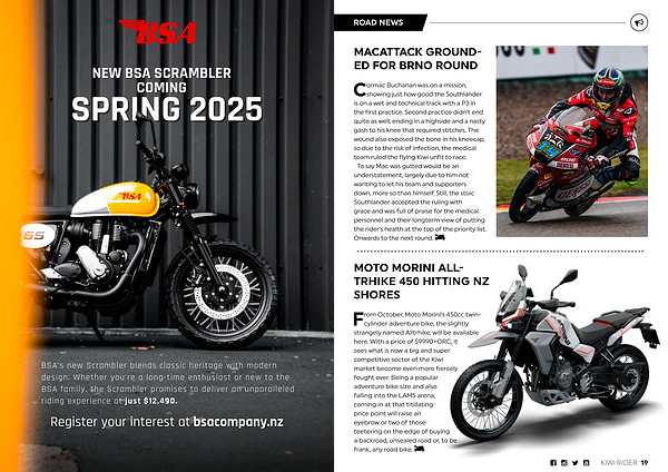 Cormac Buchanan was on a mission, showing just how good the Southlander is on a wet and technical track with a P3 in the first practice. Second practice didn’ t end quite as well, ending in a highside and a nasty gash to his knee that required stitches. The wound also exposed the bone in his kneecap, so due to the risk of infection, the medical team ruled the flying Kiwi unfit to race. To say Mac was gutted would be an understatement, largely due to him not wanting to let his team and supporters down, more so than himself. Still, the stoic Southlander accepted the ruling with grace and was full of praise for the medical personnel and their longterm view of putting the rider’ s health at the top of the priority list. Onwards to the next round.