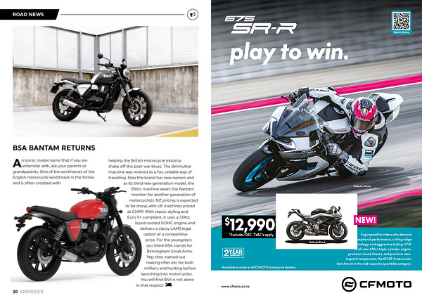 20 KIWI RIDER helping the British motorcycle industry shake off the post-war blues. The diminutive machine was revered as a fun, reliable way of travelling. Now the brand has new owners and as its third new generation model, the 350cc machine wears the Bantam moniker for another generation of motorcyclists. NZ pricing is expected to be sharp, with UK machines priced at £ 3499. With classic styling and Euro 5 + compliant, it uses a 334cc liquid-cooled DOHC engine and delivers a classy LAMS legal option at a competitive price. For the youngsters out there BSA stands for Birmingham Small Arms. Yep, they started out making rifles etc for both military and hunting before launching into motorcycles. You will find BSA is not alone in that respect.