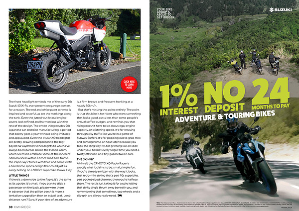 LITTLE THINGS If there’ s a downside to the Papio, it’ s the same as its upside: it’ s small. If you plan to stick a passenger on the back, please warn them in advance that the pillion perch is more a tentative suggestion than an actual seat. Long distance runs? Sure, if your idea of an adventure