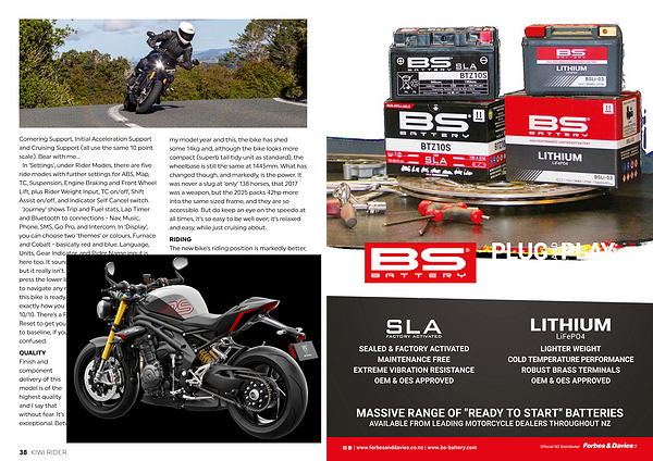 Cornering Support, Initial Acceleration Support and Cruising Support( all use the same 10 point scale). Bear with me … In‘ Settings’, under Rider Modes, there are five ride modes with further settings for ABS, Map, TC, Suspension, Engine Braking and Front Wheel Lift, plus Rider Weight Input, TC on / off, Shift Assist on / off, and Indicator Self Cancel switch.‘ Journey’ shows Trip and Fuel stats, Lap Timer and Bluetooth to connections- Nav, Music, Phone, SMS, Go Pro, and Intercom. In‘ Display’, you can choose two‘ themes’ or colours, Furnace and Cobalt- basically red and blue. Language, Units, Gear Indicator, and Rider Name input is here too. It sounds complex but it really isn’ t. Toggle and press the lower left switch to navigate any menu, and this bike is ready to set up exactly how you like it. 10 / 10. There’ s a Factory Reset to get you back to baseline, if you get confused. my model year and this, the bike has shed some 14kg and, although the bike looks more compact( superb tail tidy unit as standard), the wheelbase is still the same at 1445mm. What has changed though, and markedly, is the power. It was never a slug at‘ only’ 138 horses, that 2017 was a weapon, but the 2025 packs 42hp more into the same sized frame, and they are so accessible. But do keep an eye on the speedo at all times, it’ s so easy to be well over; it’ s relaxed and easy, while just cruising about.