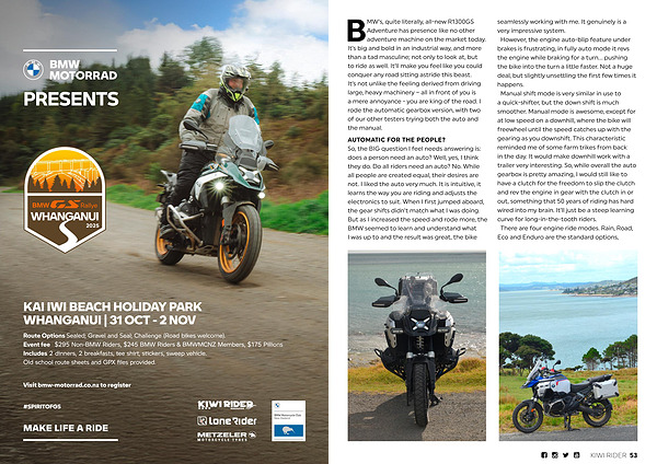 Route Options Sealed; Gravel and Seal; Challenge( Road bikes welcome). Event fee $ 295 Non-BMW Riders, $ 245 BMW Riders & BMWMCNZ Members, $ 175 Pillions Includes 2 dinners, 2 breakfasts, tee shirt, stickers, sweep vehicle. Old school route sheets and GPX files provided.