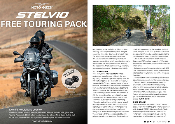 physically connected to the gearbox, rather it sends an input to the ECU by a wire to activate the actuator. It’ s mostly excellent but lacks the traditional feel on your toe of cogs engaging. I did four track sessions on it at Hampton Downs and ASA worked very well in“ M” mode and I ended up riding in that mode on road the whole time. Riding dynamics feel very similar to my R1250 GSA and the control whizz wheel and TFT user interface feel very familiar but with a few extra functions. I had the BMW tank bag and Expandable top box which was enough for the weekend away. Overal, l I feel it’ s an incremental evolution of the GSA that I will definitely be getting after my 1250 becomes too long in the tooth, although I’ ll be going for traditional clutch rather than ASA purely, because I go a little further offroad than a big heavy GSA should go! For most riders ASA would be a good choice. HUNIA RANGI