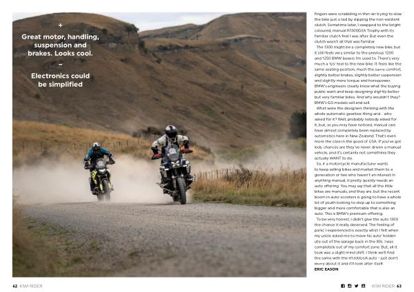 fingers were scrabbling in thin-air trying to slow the bike just a tad by slipping the non-existent clutch. Sometime later, I swapped to the bright coloured, manual R1300GSA Trophy with its familiar clutch feel I was after. But even the clutch wasn’ t all that was familiar. The 1300 might be a completely new bike, but it still feels very similar to the previous 1200 and 1250 BMW boxers I’ m used to. There’ s very much a‘ GS’ feel to the new bike. It feels like the same seating position, much the same comfort, slightly better brakes, slightly better suspension and slightly more torque and horsepower. BMW’ s engineers clearly know what the buying public want and keep designing slightly better but very familiar bikes. And why wouldn’ t they? BMW’ s GS models sell and sell. What were the designers thinking with the whole automatic gearbox thing and … who asked for it? Well, probably nobody asked for it, but, as you may have noticed, manual cars have almost completely been replaced by automatics here in New Zealand. That’ s even more the case in the good ol’ USA. If you’ ve got kids, chances are they’ ve never driven a manual vehicle, and it’ s certainly not something they actually WANT to do. So, if a motorcycle manufacturer wants to keep selling bikes and market them to a generation or two who haven’ t an interest in anything manual, it pretty quickly needs an auto offering. You may say that all the little bikes are manuals, and they are, but the recent boom in auto-scooters is going to have a whole lot of youth looking to step up to something bigger and more comfortable that is also an auto. This is BMW’ s premium offering. To be very honest, I didn’ t give the auto 1300 the chance it really deserved. The feeling of panic I experienced is exactly what I felt when my uncle asked me to move his auto’ holden ute out of the garage back in the 80s. I was completely out of my comfort zone. But, all it took was a slight mind shift. I think we’ ll find the same with the R1300GSA auto- just don’ t worry about it and it’ ll look after itself. ERIC EASON