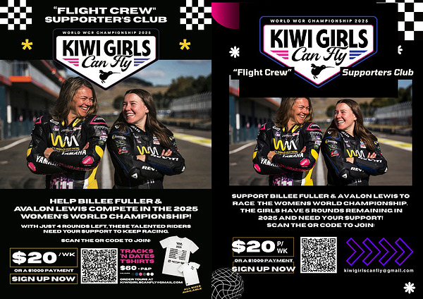 SUPPORT BILLEE FULLER & AVALON LEWIS TO RACE THE WOMENS WORLD CHAMPIONSHIP. THE GIRLS HAVE 5 ROUNDS REMAINING IN 2025 AND NEED YOUR SUPPORT! SCAN THE QR CODE TO JOIN: