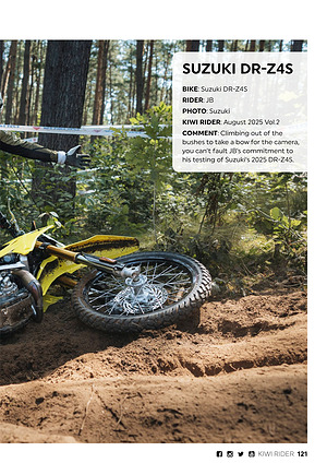 BIKE: Suzuki DR-Z4S RIDER: JB PHOTO: Suzuki KIWI RIDER: August 2025 Vol. 2 COMMENT: Climbing out of the bushes to take a bow for the camera, you can’ t fault JB’ s commitment to his testing of Suzuki’ s 2025 DR-Z4S.