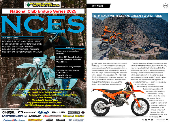 The dirt range sees a few models change their label, as in the two-strokes, other than the 300, now being called XC-W rather than EXC. The 300 retains the EXC moniker to differentiate the only Euro5 + homologated two-stroke, which opens a bunch of doors for the twostroke lovers out there, and let’ s face it – who isn’ t? Yes, the impossible has happened. A two-stroke that runs so clean, you could say tangerine is the new green.