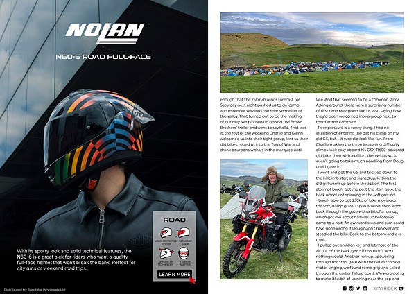 enough that the 75km / h winds forecast for Saturday next night pushed us to de-camp and make our way into the relative shelter of the valley. That turned out to be the making of our rally. We pitched up behind the Brown Brothers’ trailer and went to say hello. That was it, the rest of the weekend Charlie and Glenn welcomed us into their tight group, lent us their dirt bikes, roped us into the Tug of War and drank bourbons with us in the marquee until late. And that seemed to be a common story. Asking around, there were a surprising number of first time rally-goers like us, also saying how they’ d been welcomed into a group next to them at the campsite. Peer pressure is a funny thing. I had no intention of entering the dirt hill climb on my old GS, but … it sure did look like fun. From Charlie making the three increasing difficulty climbs look easy aboard his GSX-R600-powered dirt bike, then with a pillion, then with two, it wasn’ t going to take much needling from Doug until I gave in. I went and got the GS and trickled down to the hillclimb start and signed up, letting the old girl warm up before the action. The first attempt barely got me past the start gate, the back wheel just spinning in the soft ground- barely able to get 230kg of bike moving on the soft, damp grass. I spun around, then went back through the gate with a bit of a run-up, which got me about halfway up before we came to a halt. An awkward stop and turn could have gone wrong if Doug hadn’ t run over and steadied the bike. Back to the bottom and a rethink. I pulled out an Allen key and let most of the air out of the back tyre- if this didn’ t work nothing would. Another run-up … powering through the start gate with the old air-cooled motor singing, we found some grip and sailed through the earlier failure point. We were going to make it! A bit of spinning near the top and