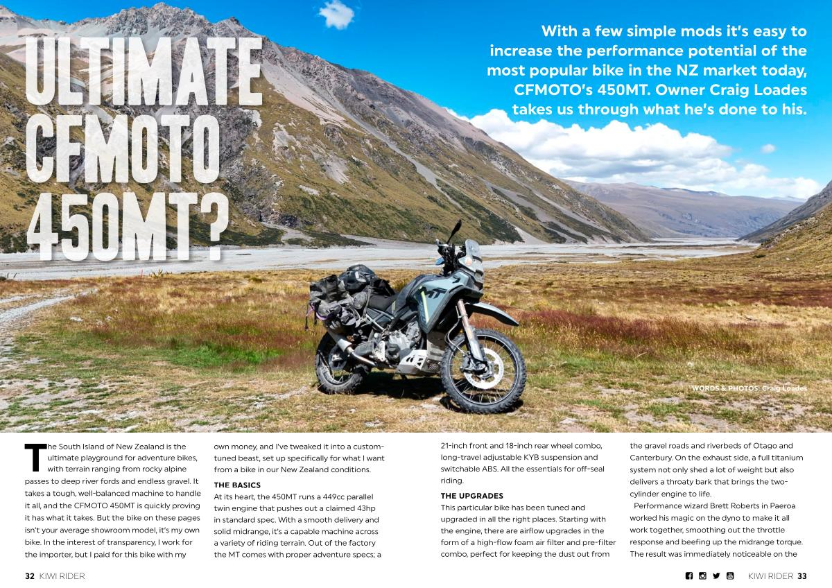 The South Island of New Zealand is the ultimate playground for adventure bikes, with terrain ranging from rocky alpine passes to deep river fords and endless gravel. It takes a tough, well-balanced machine to handle it all, and the CFMOTO 450MT is quickly proving it has what it takes. But the bike on these pages isn’ t your average showroom model, it’ s my own bike. In the interest of transparency, I work for the importer, but I paid for this bike with my own money, and I’ ve tweaked it into a customtuned beast, set up specifically for what I want from a bike in our New Zealand conditions.