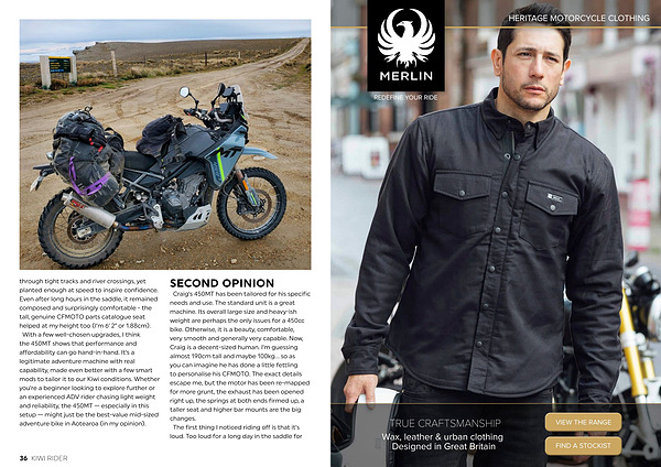 through tight tracks and river crossings, yet planted enough at speed to inspire confidence. Even after long hours in the saddle, it remained composed and surprisingly comfortable- the tall, genuine CFMOTO parts catalogue seat helped at my height too( I’ m 6’ 2” or 1.88cm). With a few well-chosen upgrades, I think the 450MT shows that performance and affordability can go hand-in-hand. It’ s a legitimate adventure machine with real capability, made even better with a few smart mods to tailor it to our Kiwi conditions. Whether you’ re a beginner looking to explore further or an experienced ADV rider chasing light weight and reliability, the 450MT— especially in this setup— might just be the best-value mid-sized adventure bike in Aotearoa( in my opinion).