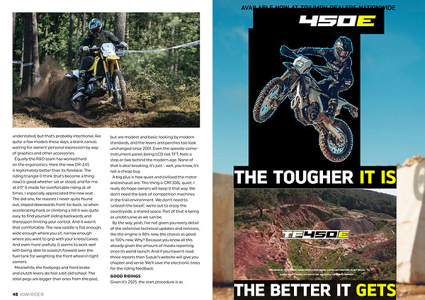 but are modest and basic-looking by modern standards, and the levers and perches too look unchanged since 2001. Even the speedo-comeinstrument panel, being LCD not TFT, feels a step or two behind the modern age. None of that is deal breaking, it’ s just … well, you know, it’ s not a cheap buy. A big plus is how quiet and civilised the motor and exhaust are. This thing is CRF300L quiet. I really do hope owners will keep it that way. We don’ t need the bark of competition machines in the trail environment. We don’ t need to‘ unleash the beast’, we’ re out to enjoy the countryside, a shared space. Part of that is being as unobtrusive as we can be. By the way, yeah, I’ ve not given you every detail of the extensive technical updates and revisions, like the engine is 80 % new, the chassis as good as 100 % new. Why? Because you know all this already given the amount of media reporting since its world launch. And if you haven’ t read those reports then Suzuki’ s website will give you chapter and verse. We’ ll save the electronic trees for the riding feedback.