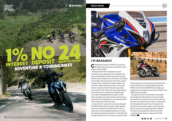 T & Cs: This nil deposit and 1 % p. a. fixed interest rate finance offer is fixed for 24 months and applies to new Suzuki DS250SX, DL650A / AU / X, DL800RQ / DE, DL1050RJ, GSX-S1000GT / GX, and GSX800FR / RQ models purchased between 1 / 6 / 25 and 31 / 8 / 25 at participating Suzuki dealers. A PPSR fee of $ 10.35, $ 130 UDC loan fee and $ 200 dealer origination fee applies. Suzuki Finance is provided by UDC Finance Limited. Lending criteria, fees and standard terms and conditions apply. Available at participating Suzuki dealers, and while stocks last. Excludes fleet purchases, demo units and all other promotions. www. suzuki. co. nz
