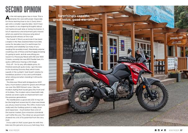 As the old saying goes, less is more. This is certainly the case with power. Especially for those learning how to do it. Every time I get onto a smaller capacity bike, I don’ t have any regrets or any lingering thoughts about not having enough grip or losing my license. A lot of experience and enjoyment gets missed when you spend too long worrying about keeping both wheels on the road. The Suzuki V-Strom as we know it has been a staple in the New Zealand Adventure bike scene for decades now. It is well known for versatility and reliability( as many of you reading this possibly know). Absolutely anyone could buy one of these and feel happy knowing it’ s going to work, and do everything you need it to. Previously fitted with 650 and 1000 V-twins, recently the new 800 Parallel twin, it’ s quite a difference having a 250 Single. First off- for its very affordable price, it’ s finished and built quite nicely. I got the bike in the stunning Sonoma Red, which looks superb in the sunlight. Seat height relative to handlebar position is nice and comfortable when sitting and when standing it still works quite well. This bike was fitted with bridgestone AX41 tyres, much better suited for gravel and offroad use over the OEM fitment ones. I like the modern styling that Suzuki gives the front end of its bikes. The modern retro mixed with rally stands out and is quite an improvement over the previous generations. The dashboard is a good old LCD. It may not be the brightest screen but it’ s clear and shows you all you need to know. The 249cc motor runs really well, the fuelling system is really clean and responsive- much better than a lot of the learner market, Euro emissions standards can’ t stifle this one. The initial run around town showed me a lot of its potential from the very start. A nice add-on that Suzuki gave me with this bike was the genuine accessory tank bag. Nice