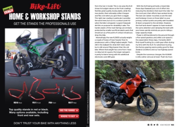 With the KLR being primarily a travel bike these days Kawasaki put a lot of effort into reducing the vibrations that reach the rider . For the most part , their efforts have worked nicely . The bars are rubber mounted , as are the seat and footpegs ( more on those later ) so your primary contact points are pretty well insulated . At least compared to the old bikes . However , the fuel tank doesn ’ t appear to have received the same attention and clamping the tank with your knees quickly reminds you you ’ re riding a large capacity single . Power is still transferred to the ground through a five-speed gearbox , and , while a six-speed is the expectation these days , I honestly didn ’ t find myself hunting for a sixth gear often during my time with the KLR . For adventure touring , the factory gearing seems pretty good for New Zealand conditions and our low highway speed limits . Despite the numerous changes , the KLR650 is still a rather old soul at heart . That ’ s far from
