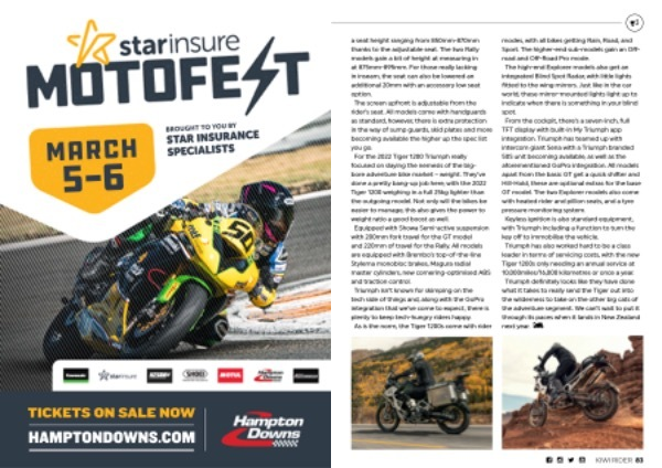 a seat height ranging from 850mm-870mm thanks to the adjustable seat . The two Rally models gain a bit of height at measuring in at 875mm-895mm . For those really lacking in inseam , the seat can also be lowered an additional 20mm with an accessory low seat option . The screen upfront is adjustable from the rider ’ s seat . All models come with handguards as standard , however , there is extra protection in the way of sump guards , skid plates and more becoming available the higher up the spec list you go . For the 2022 Tiger 1200 Triumph really focused on slaying the nemesis of the bigbore adventure bike market – weight . They ’ ve done a pretty bang-up job here , with the 2022 Tiger 1200 weighing in a full 25kg lighter than the outgoing model . Not only will the bikes be easier to manage , this also gives the power to weight ratio a good boost as well . Equipped with Showa Semi-active suspension with 200mm fork travel for the GT model and 220mm of travel for the Rally . All models are equipped with Brembo ’ s top-of-the-line Stylema monobloc brakes , Magura radial master cylinders , new cornering-optimised ABS and traction control . Triumph isn ’ t known for skimping on the tech side of things and , along with the GoPro integration that we ’ ve come to expect , there is plenty to keep tech-hungry riders happy . As is the norm , the Tiger 1200s come with rider modes , with all bikes getting Rain , Road , and Sport . The higher-end sub-models gain an Offroad and Off-Road Pro mode . The high-end Explorer models also get an integrated Blind Spot Radar , with little lights fitted to the wing mirrors . Just like in the car world , these mirror-mounted lights light up to indicate when there is something in your blind spot . From the cockpit , there ’ s a seven-inch , full TFT display with built-in My Triumph app integration . Triumph has teamed up with intercom giant Sena with a Triumph branded 50S unit becoming available , as well as the aforementioned GoPro integration . All models apart from the basic GT get a quick shifter and Hill-Hold , these are optional extras for the base GT model . The two Explorer models also come with heated rider and pillion seats , and a tyre pressure monitoring system . Keyless ignition is also standard equipment , with Triumph including a function to turn the key off to immobilise the vehicle . Triumph has also worked hard to be a class leader in terms of servicing costs , with the new Tiger 1200s only needing an annual service at 10,000miles / 16,000 kilometres or once a year . Triumph definitely looks like they have done what it takes to really send the Tiger out into the wilderness to take on the other big cats of the adventure segment . We can ’ t wait to put it through its paces when it lands in New Zealand next year .