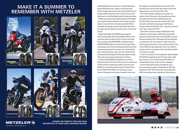 and MotoMania next year), it is Justin Reid who heads the Ninja class, while in the Hyosungs, Scott Findlay saw his winning streak broken by an elusive 0.005 seconds in the 1-Hour race, but he continues to comfortably lead the Hyosung class. Phillip Law and Angus Ravenwood comfortably secured the Sidecar title for the season, having taken nine wins from 12 starts; but both Peter Goodwin & George Vennell and Dave McArthur & Jordan Burley tasted a victory each at the final round. Rogan Chandler( S1000RR) was fastest in Senior, along with Ray Clee( GSXR-1000) as the only two riders to dip into the 1:04s on the day. But Luca Durning( S1000RR) and Dave Sharp( CBR1000RR-R) were on their heels, with Sharp emerging as the Formula Auckland Series winner, having scored points in every race. Consistency wins championships, with one non-points finish at Round One being the difference back to Ray Clee, who was impressively quick all Series. Ian Reed( S1000RR) completed an almost perfect season( 11 from 12) in Formula Auckland( 1:09), while in Supersport 600 it was the lone ZX6R of Jesse Stroud who had to fend off the trio of D6M KTM RC8Cs of Cameron Leslie, Hamish Simpson and Logan Rowell. Leslie had the edge and scooped the Series title, after another four wins on the day. Both Leslie and Stroud were circulating in the 1:06s. The Intermediate category has given all season, with full grids and exceptional action through the field. The highlight was the ProTwin 650; and Cameron Leslie( YZF-R7) complemented his Supersport 600 Series victory with the ProTwin title – by just six points over Tyler King( YZF-R7). Zak Fuller and the Honda CBR650R made a potent combination, and Fuller sealed the Superlite Series title over the GSX-8Rs of Jesse Stroud and Ray Clee. Although Stroud did bag a second win for the season in the final race, having previously won a race at Round One. The Fuller / CBR combo lapping in the 1:9s made it tough work for everyone, with only Stroud able to match the pace. In her first season of competition, Alyssa Boyd( GT250R) wrapped up the ProLite Series title by 6.5 points over Troy Fowles( GT250R), an outstanding result in the Junior category. And if that wasn’ t close enough for you – the one point margin in Supersport 150 Troy Stephens( YZF-R15) had over Samuel Chave( R15) should get your attention. Billy Macrae