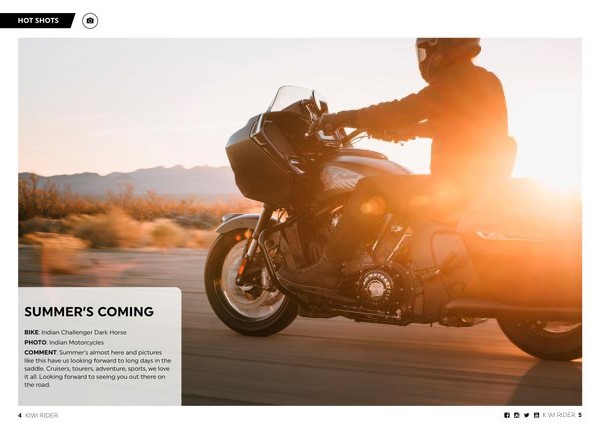 BIKE: Indian Challenger Dark Horse PHOTO: Indian Motorcycles COMMENT: Summer’ s almost here and pictures like this have us looking forward to long days in the saddle. Cruisers, tourers, adventure, sports, we love it all. Looking forward to seeing you out there on the road.