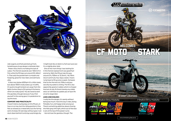 side eagerly and feels planted up front, tempting you to go deeper and brake later. Power-wise, there’ s no hiding the lack of cubes. The Hornet would do over 100km / h in first, while the R3 tops out around 50 – 60km / h. That said, the parallel twin is smooth and forgiving, great for new riders and old hacks alike. It likes revs; below 6000rpm it’ s a little meek, but above 7000 it really wakes up. In traffic, it’ s quick enough to beat cars away from the lights( unless they’ re EVs giving it the beans, which are really quick). You do need to work the gearbox, though, because if you find yourself in the wrong gear, it is pedestrian to say the least.