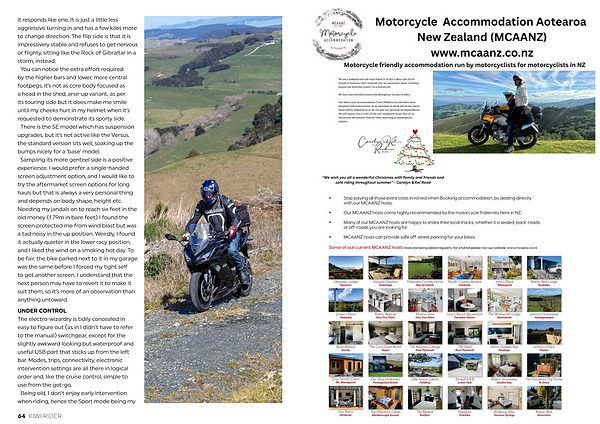 it responds like one. It is just a little less aggressive turning in and has a few kilos more to change direction. The flip side is that it is impressively stable and refuses to get nervous or flighty, sitting like the Rock of Gibraltar in a storm, instead. You can notice the extra effort required by the higher bars and lower, more central footpegs, it’ s not as core body focused as a head in the shed, arse-up variant, as per its touring side but it does make me smile until my cheeks hurt in my helmet when it’ s requested to demonstrate its sporty side. There is the SE model which has suspension upgrades, but it’ s not active like the Versus, the standard version sits well, soaking up the bumps nicely for a‘ base’ model. Sampling its more genteel side is a positive experience. I would prefer a single-handed screen adjustment option, and I would like to try the aftermarket screen options for long hauls but that is always a very personal thing and depends on body shape, height etc. Needing my jandals on to reach six feet in the old money( 1.79m in bare feet) I found the screen protected me from wind blast but was a tad noisy in the up position. Weirdly, I found it actually quieter in the lower racy position, and I liked the wind on a smoking hot day. To be fair, the bike parked next to it in my garage was the same before I forced my tight self to get another screen. I understand that the next person may have to revert it to make it suit them, so it’ s more of an observation than anything untoward.