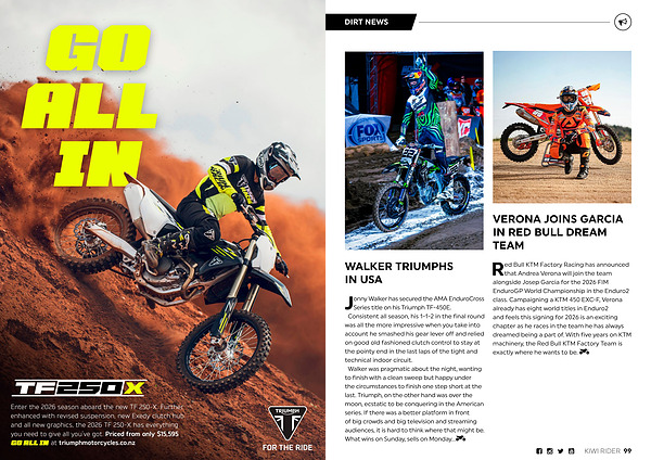Series title on his Triumph TF-450E. Consistent all season, his 1-1-2 in the final round was all the more impressive when you take into account he smashed his gear lever off and relied on good old fashioned clutch control to stay at the pointy end in the last laps of the tight and technical indoor circuit. Walker was pragmatic about the night, wanting to finish with a clean sweep but happy under the circumstances to finish one step short at the last. Triumph, on the other hand was over the moon, ecstatic to be conquering in the American series. If there was a better platform in front of big crowds and big television and streaming audiences, it is hard to think where that might be. What wins on Sunday, sells on Monday …