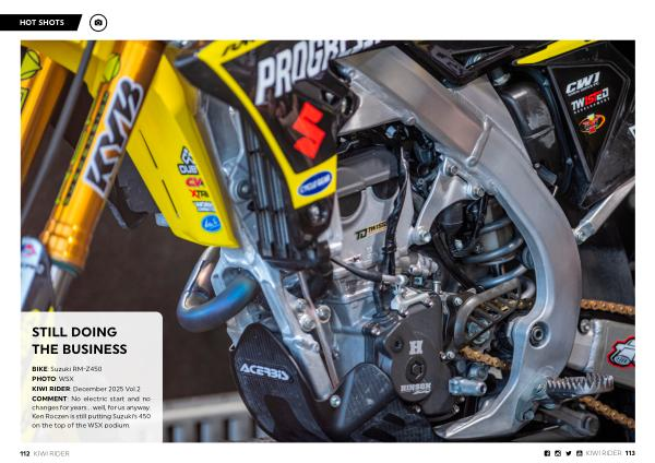 BIKE: Suzuki RM-Z450 PHOTO: WSX KIWI RIDER: December 2025 Vol. 2 COMMENT: No electric start and no changes for years … well, for us anyway. Ken Roczen is still putting Suzuki’ s 450 on the top of the WSX podium.