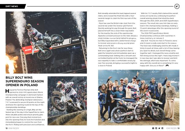 Husqvarna Factory Racing’ s Billy Bolt opened his 2026 FIM SuperEnduro World Championship campaign in dominant fashion with an overall victory at round one in Gliwice, Poland. The defending champion delivered a 1-2-1 scorecard to secure 60 points on the night and leave the opening round at the top of the championship standings. Starting the evening on a high, Billy set the fastest lap of the day in the SuperPole to claim three valuable points and ensure priority gate pick for race one. Carrying that momentum into the opening final, he took the holeshot and immediately began to control the race from the front. Riding with precision and confidence,
