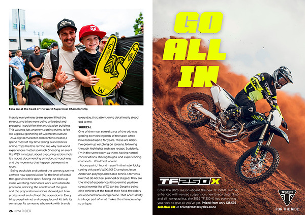 SURREAL One of the most surreal parts of the trip was getting to meet legends of the sport who I have looked up to for years. These are riders I’ ve grown up watching on screens, following through highlights and race recaps. Suddenly, I’ m in the same room as them, having normal conversations, sharing laughs, and experiencing moments … it’ s almost unreal. At one point, I found myself in the hotel lobby seeing this year’ s WSX SX1 Champion Jason Anderson playing some table tennis. Moments like that do not feel planned or staged. They are the kind of experiences that remind you how special events like WSX can be. Despite being elite athletes at the top of their field, the riders are approachable and genuine. That accessibility is a huge part of what makes the championship so unique.