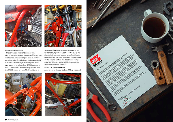 just like back in the day. The carb was a mess and needed new everything, so a larger( read‘ faster’) 34mm carb was located. With the engine back in pristine condition after Brett Roberts Motorcycles built it into a‘ Quarter Midget’ spec engine( think oval racing in small cars), an XR250 swingarm and a CR125 shock were expertly grafted into the XR200 frame by Mark MacDonald and a
