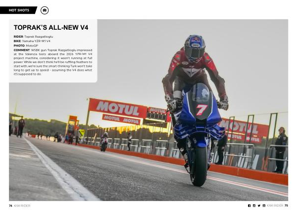 RIDER: Toprak Razgatlioglu BIKE: Yamaha YZR-M1 V4 PHOTO: MotoGP COMMENT: WSBK gun Toprak Razgatlioglu impressed at the Valencia tests aboard the 2026 YZR-M1 V4 project machine, considering it wasn’ t running at full power. While we don’ t think he’ ll be ruffling feathers to start with, we’ re sure the smart-thinking Turk won’ t take long to get up to speed- assuming the V4 does what it’ s supposed to do.