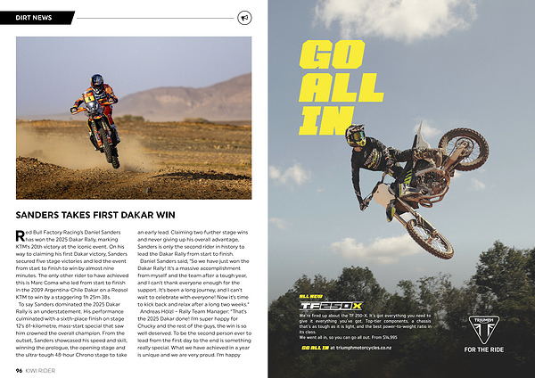 Red Bull Factory Racing ’ s Daniel Sanders has won the 2025 Dakar Rally , marking KTM ’ s 20th victory at the iconic event . On his way to claiming his first Dakar victory , Sanders secured five stage victories and led the event from start to finish to win by almost nine minutes . The only other rider to have achieved this is Marc Coma who led from start to finish in the 2009 Argentina-Chile Dakar on a Repsol KTM to win by a staggering 1h 25m 38s . To say Sanders dominated the 2025 Dakar Rally is an understatement . His performance culminated with a sixth-place finish on stage 12 ’ s 61-kilometre , mass-start special that saw him crowned the overall champion . From the outset , Sanders showcased his speed and skill , winning the prologue , the opening stage and the ultra-tough 48-hour Chrono stage to take an early lead . Claiming two further stage wins and never giving up his overall advantage , Sanders is only the second rider in history to lead the Dakar Rally from start to finish . Daniel Sanders said , “ So we have just won the Dakar Rally ! It ’ s a massive accomplishment from myself and the team after a tough year , and I can ’ t thank everyone enough for the support . It ’ s been a long journey , and I can ’ t wait to celebrate with everyone ! Now it ’ s time to kick back and relax after a long two weeks .” Andreas Hölzl – Rally Team Manager : “ That ’ s the 2025 Dakar done ! I ’ m super happy for Chucky and the rest of the guys , the win is so well deserved . To be the second person ever to lead from the first day to the end is something really special . What we have achieved in a year is unique and we are very proud . I ’ m happy