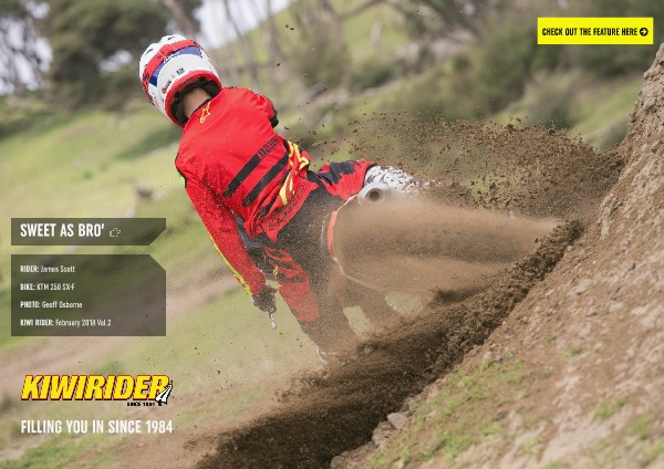 SWEET AS BRO’ RIDER: James Scott BIKE: KTM 250 SX-F PHOTO: Geoff Osborne KIWI RIDER: February 2018 Vol.2 FILLING YOU IN SINCE 1984